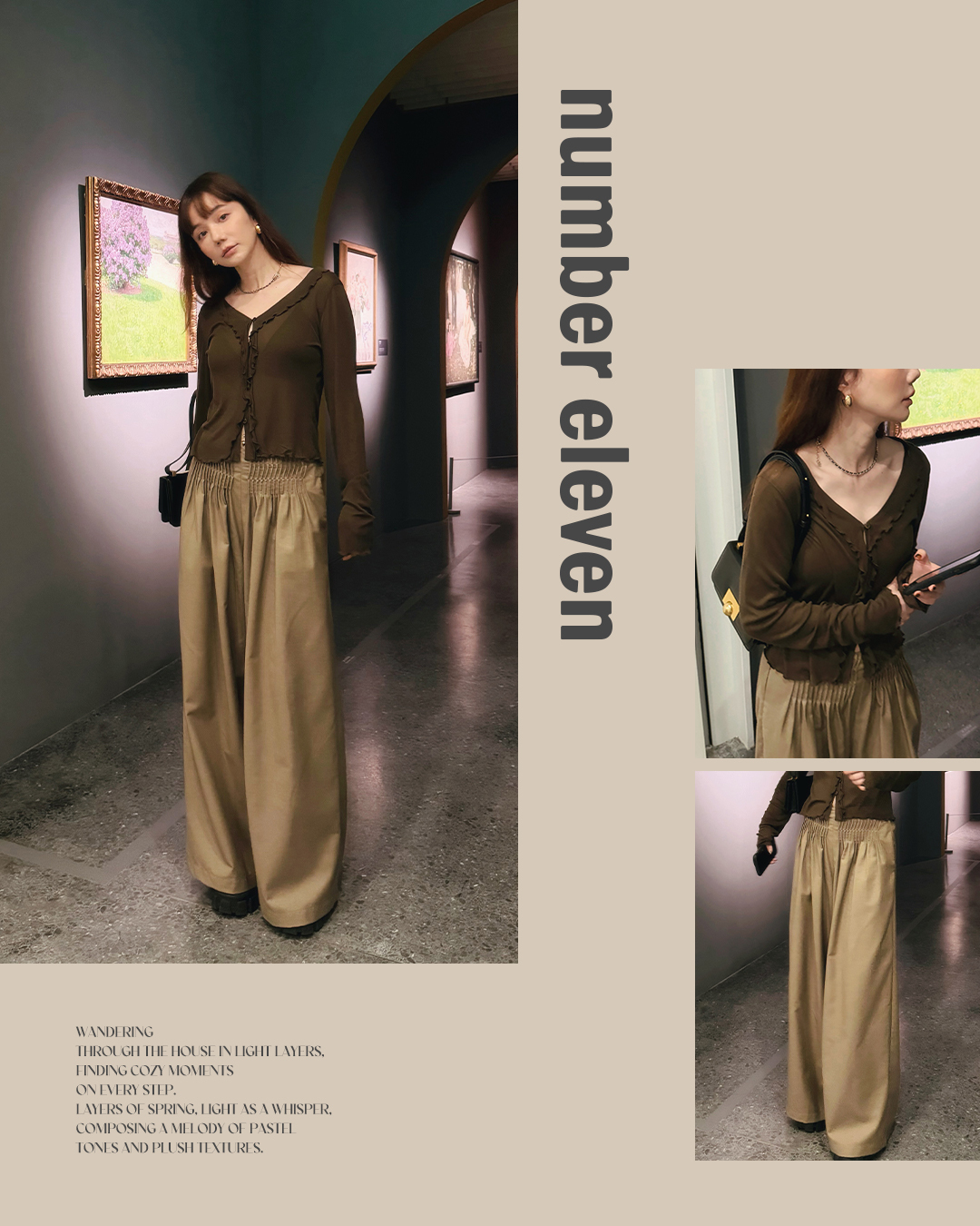 下身搭配高腰卡其色寬褲,布料柔軟有垂墜度,寬鬆的褲管讓下身線條更顯筆直修長,腰頭打褶設計與上衣的荷葉造型相互呼應同時還可以修飾小腹。