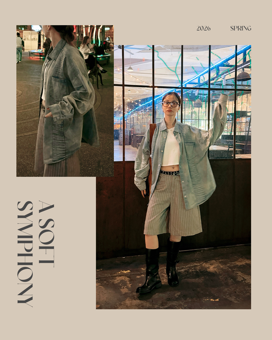 上衣選用壓褶洗水中性牛仔襯衫,以洗水刷色的中性色彩與細膩壓褶紋理結合,作為整體穿搭的亮點。