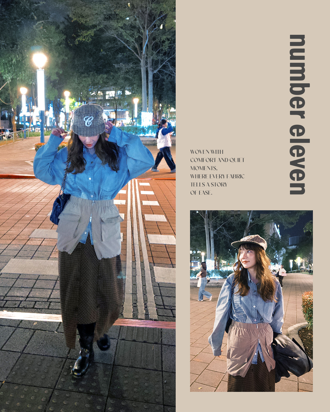 下身搭配前缺口排釦格紋長裙,腰間疊加立體口袋縮口短裙作為裙簾搭配,為穿搭增添層次與工裝氣息,