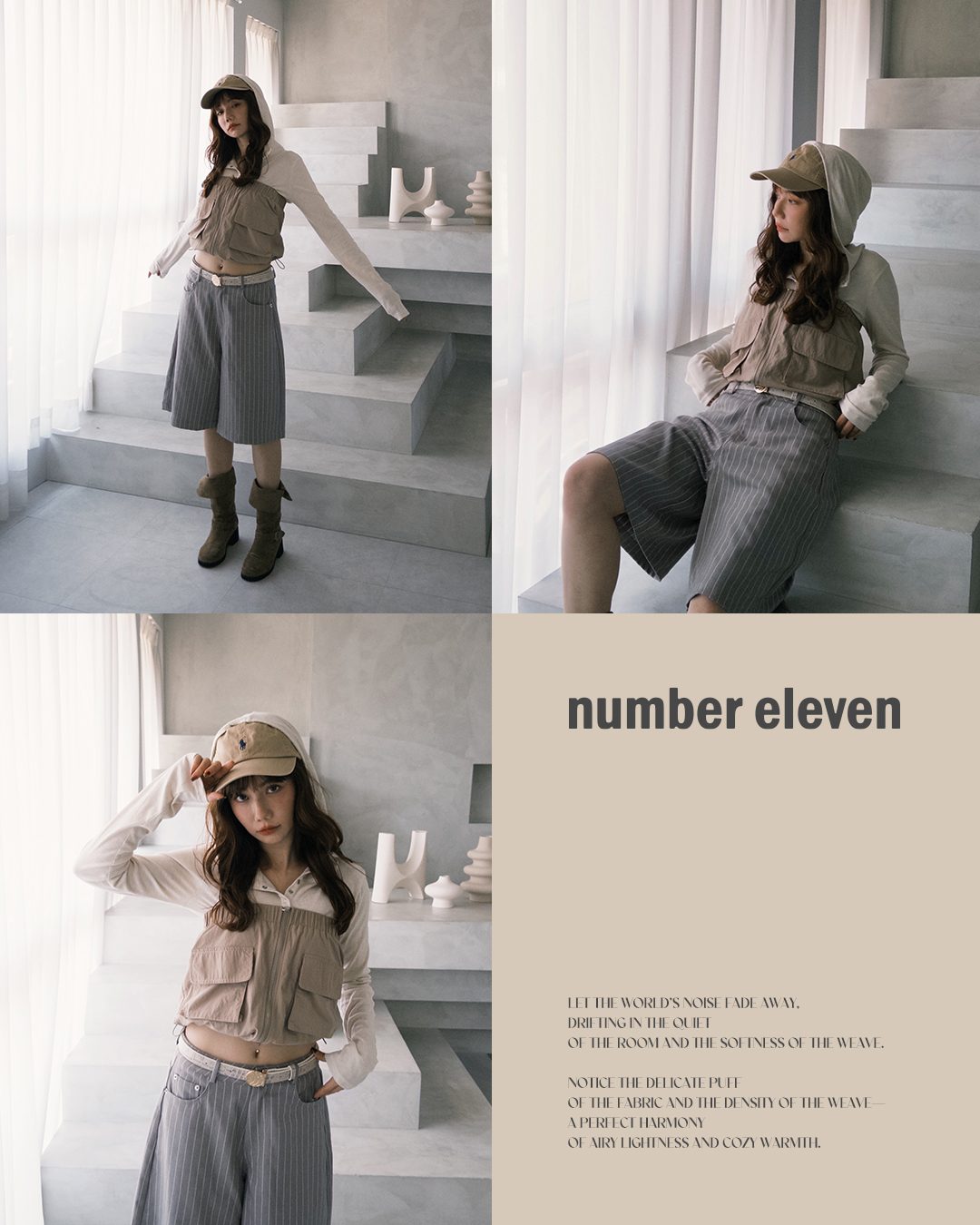 下身選擇條紋寬版短褲,選用帶有挺度的布料,增添穿搭的份量感,