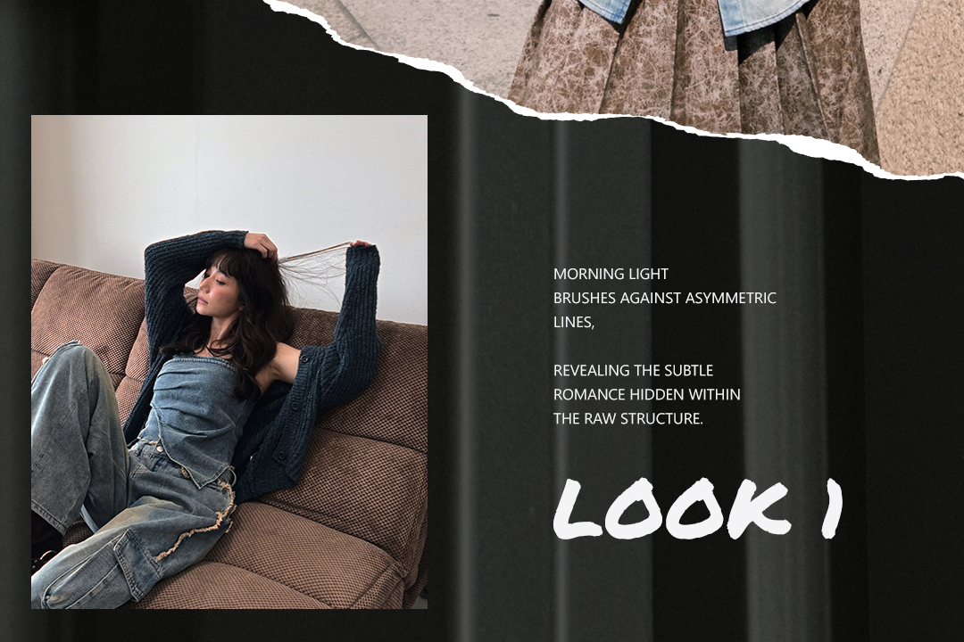 下身搭配鬚邊仿舊洗水繭型工裝牛仔褲,透過刷舊工藝與側邊鬚邊細節,讓衣服更有工業率性氣息。