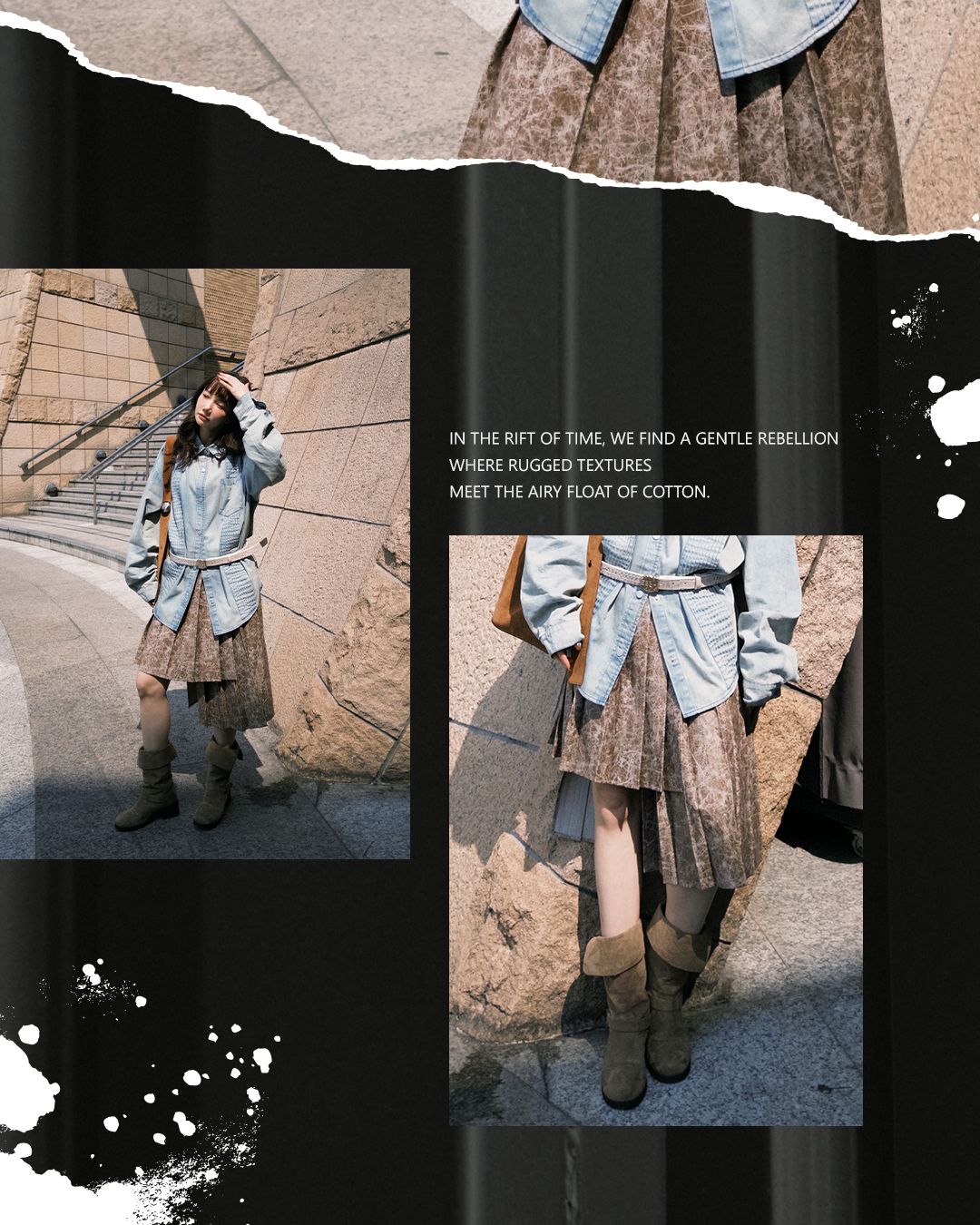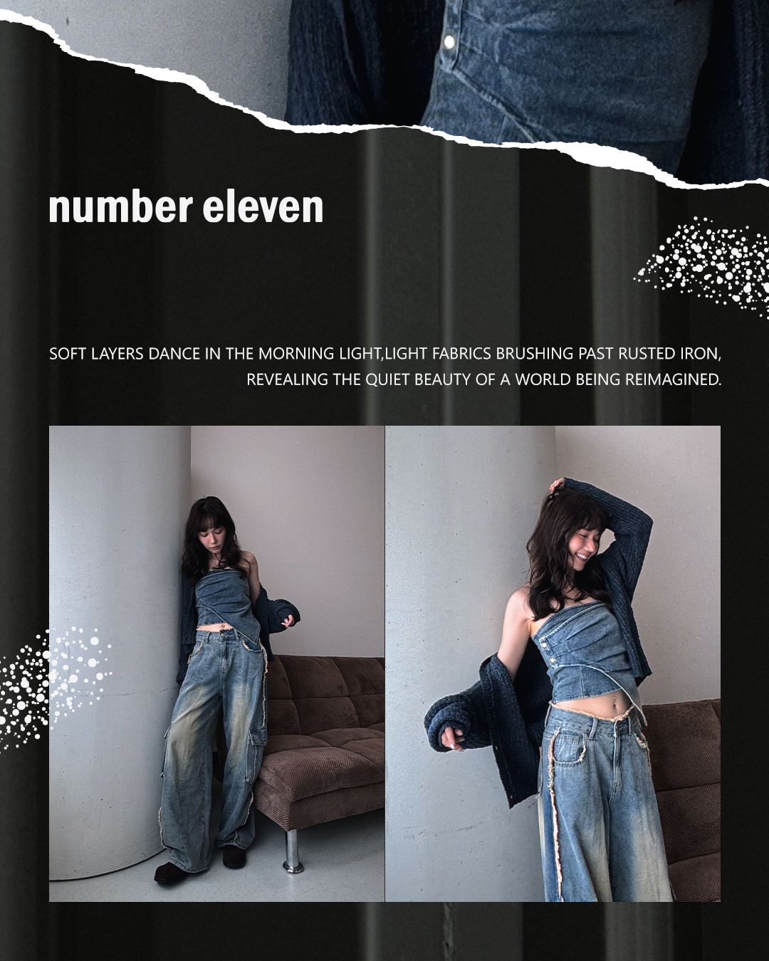 上身選用抓皺洗舊牛仔平口上衣,採用輕磅丹寧布料,提升穿著時的柔軟度與舒適性。