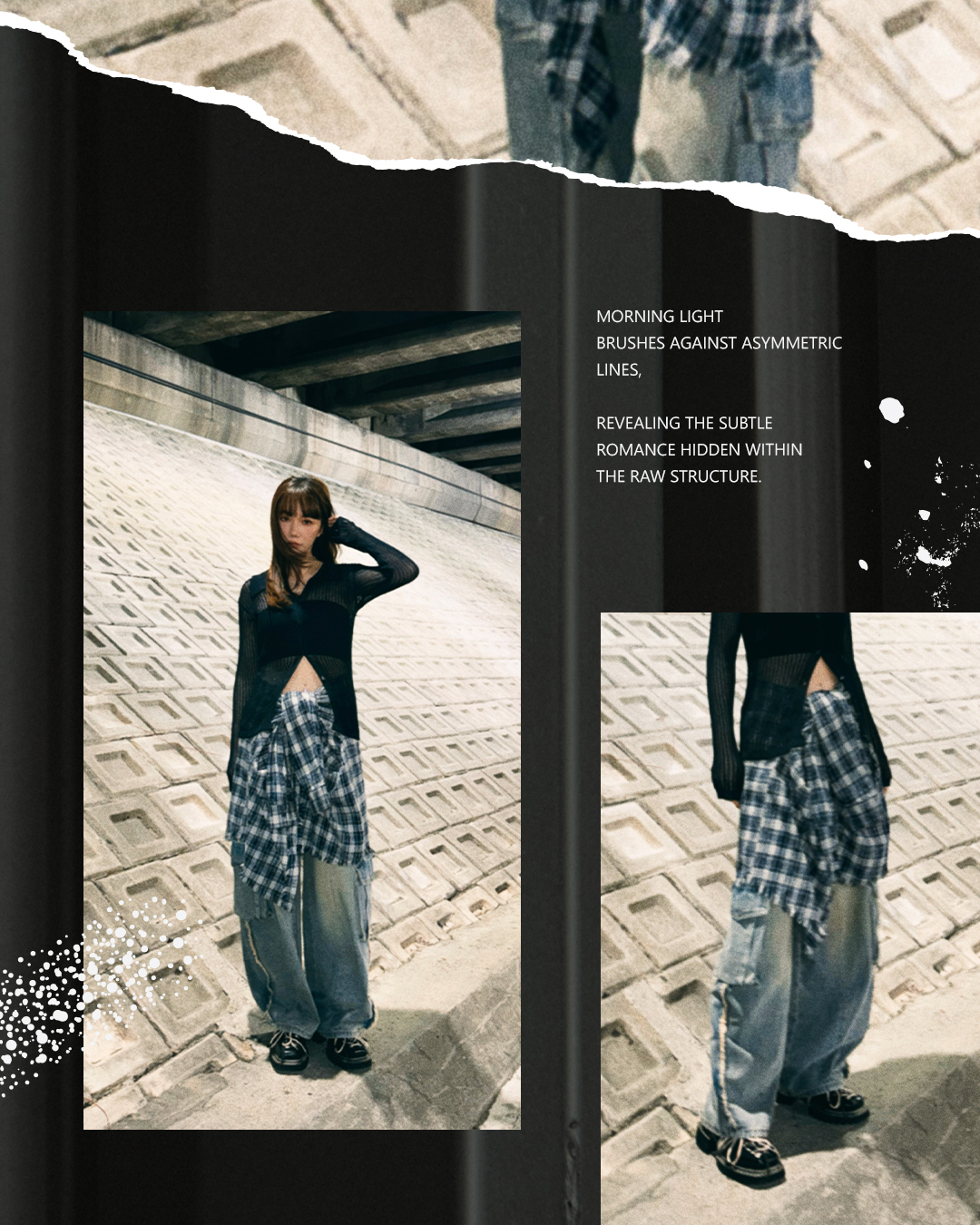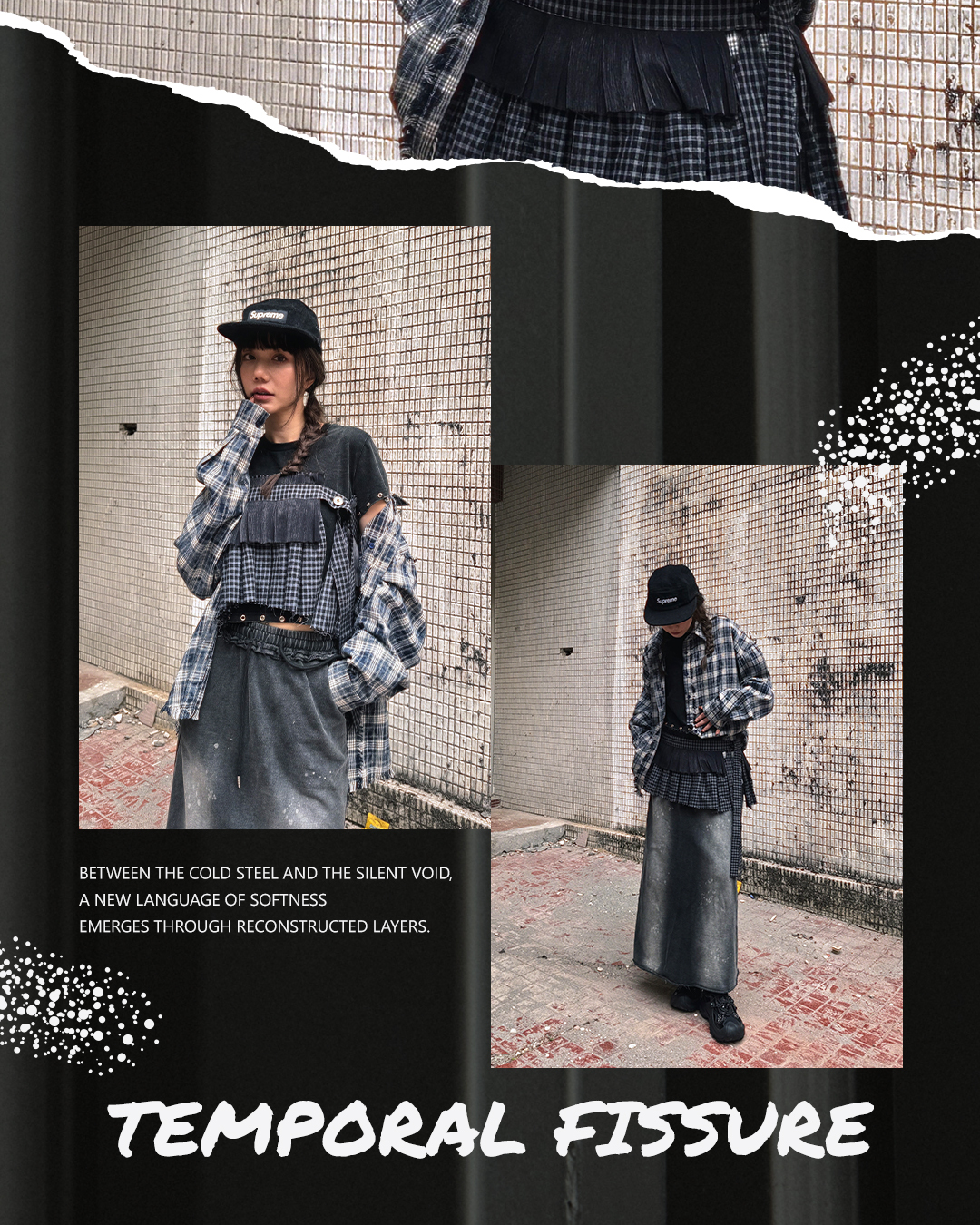 外層搭配抽鬚格紋襯衫,以寬鬆版型平衡整體比例,增添日常穿著的實用性與休閒感。