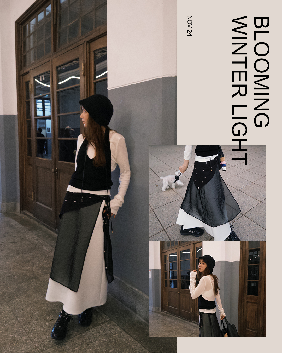 下半身是白色長裙,太空棉材質修身不易皺,舒適度與挺度更是沒話說,再疊上一件透紗縫釦裙簾,增加設計感與層次線條