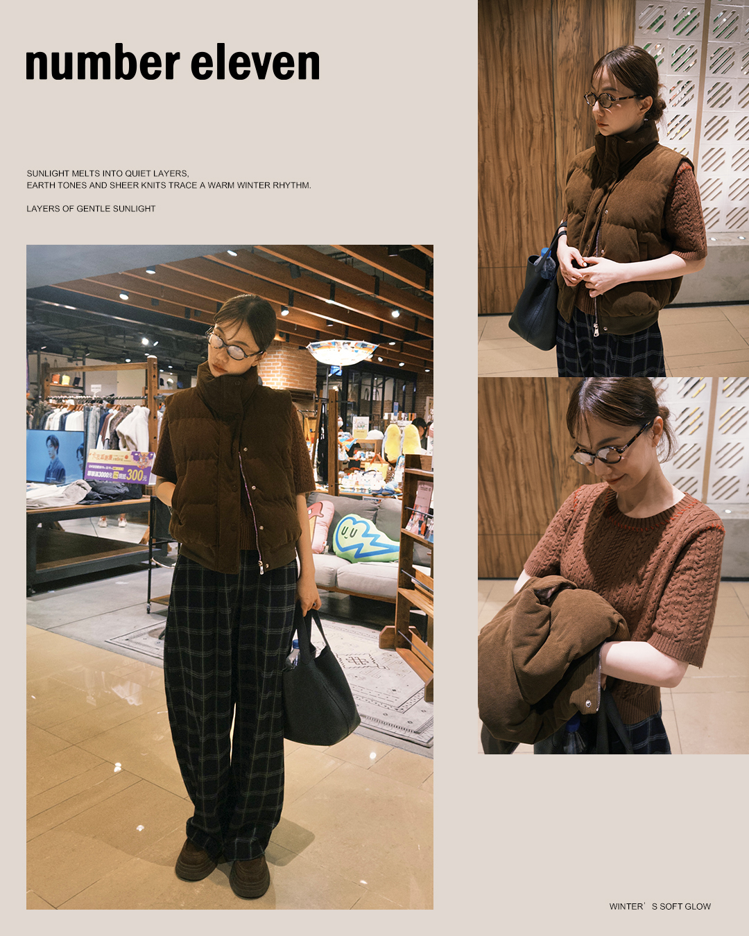 上身是深咖啡色短袖針織上衣,領口與肩膀剪接處有紅色穿線做點綴,外面疊穿厚實的鋪棉背心,材質上溫暖又舒適,層次明顯有辨識度。