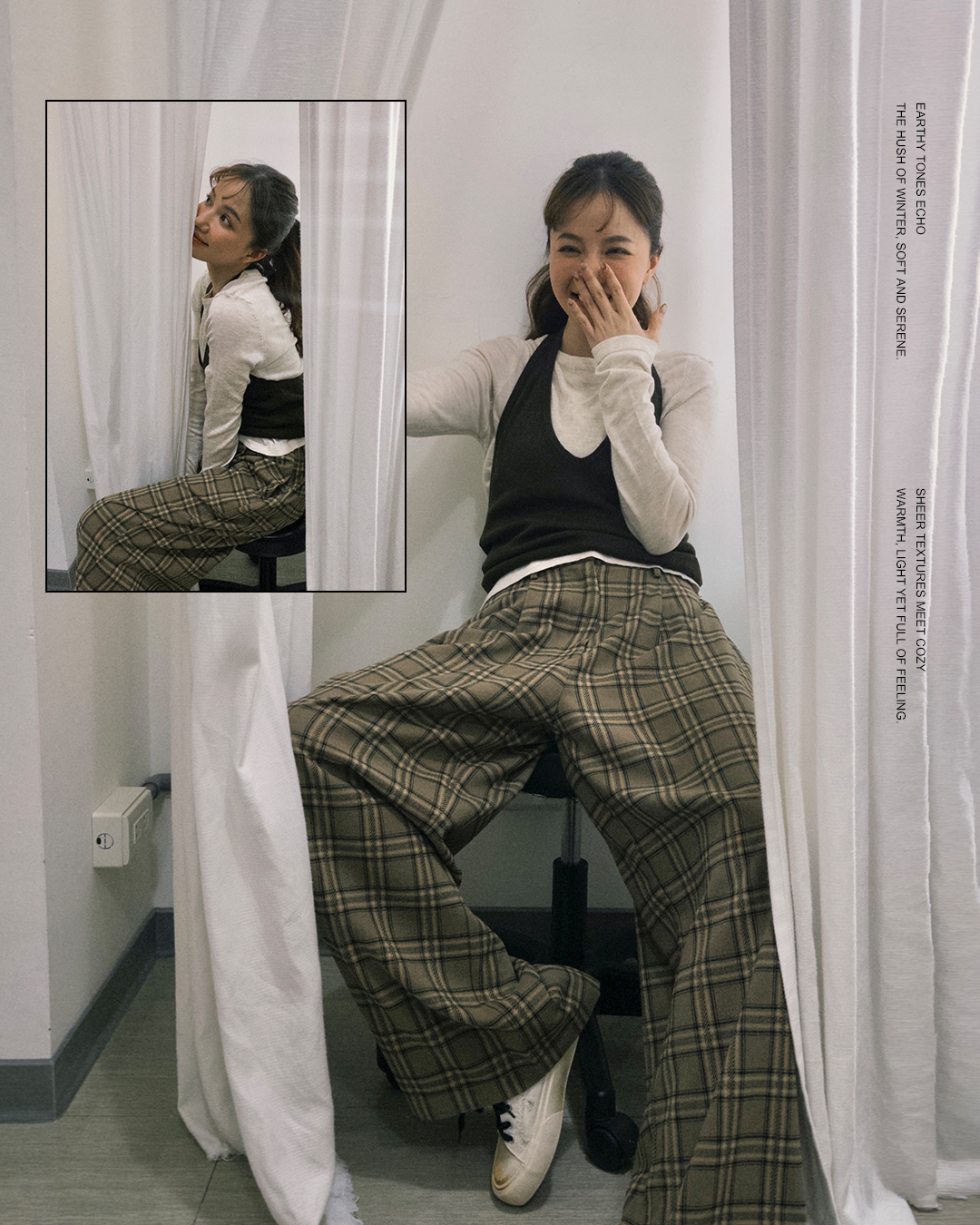 下半身選用駝色打褶格紋落地長褲,寬版版型為整體增添率性慵懶氣息,顏色與上身相互呼應,同時帶著復古與中性並存的味道。