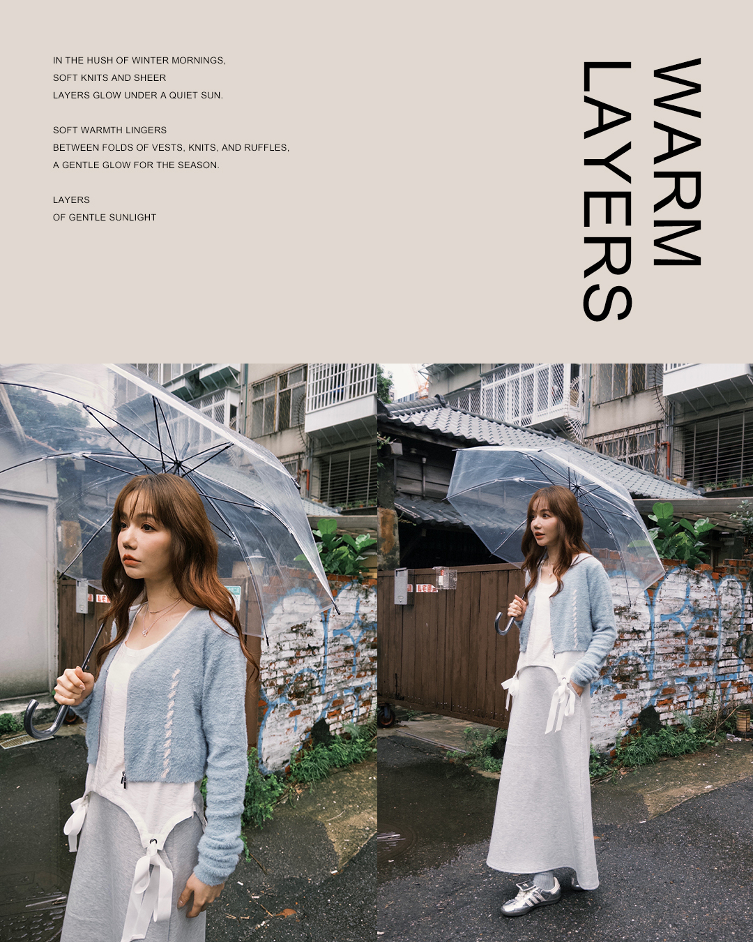 外面罩一件短版毛絨淺藍針織外套,柔軟可愛,又能拉高腰線讓比例看起來更好。