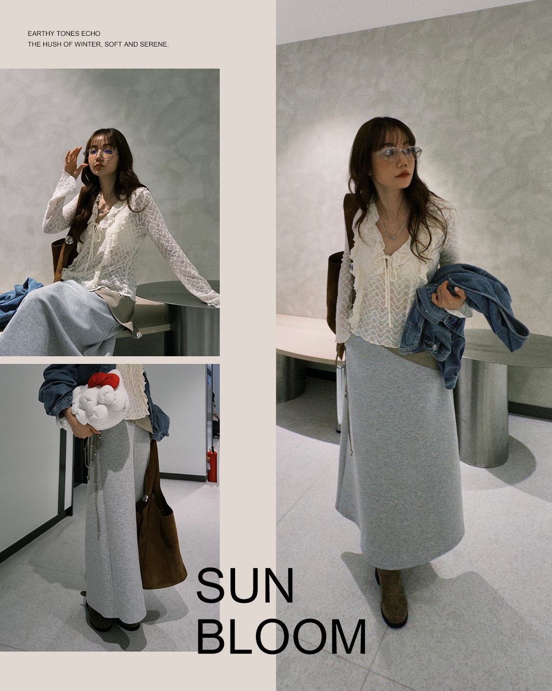 這是一組浪滿感單品與休閒單品的碰撞搭配。緹花荷葉V領綁帶上衣,V領荷葉邊設計自帶浪漫感,下身搭配素面太空棉設計長裙
