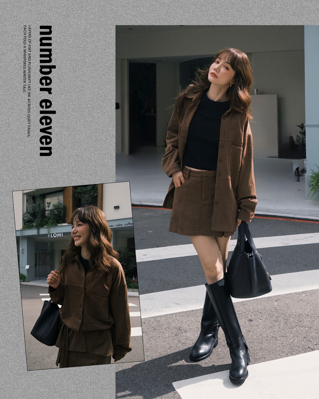 下身配同色絨感盒褶褲裙,褶線增加立體感,再搭長靴拉長比例,整體深色調沉穩俐落,呈現個性優雅的秋冬日常穿搭。