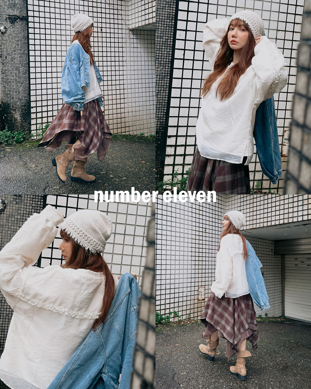 外搭淺藍圓領拋袖洗水牛仔外套,澎袖線條營造立體輪廓,與下身深咖啡不規則格紋層次裙形成視覺對比,增加造型層次感。
